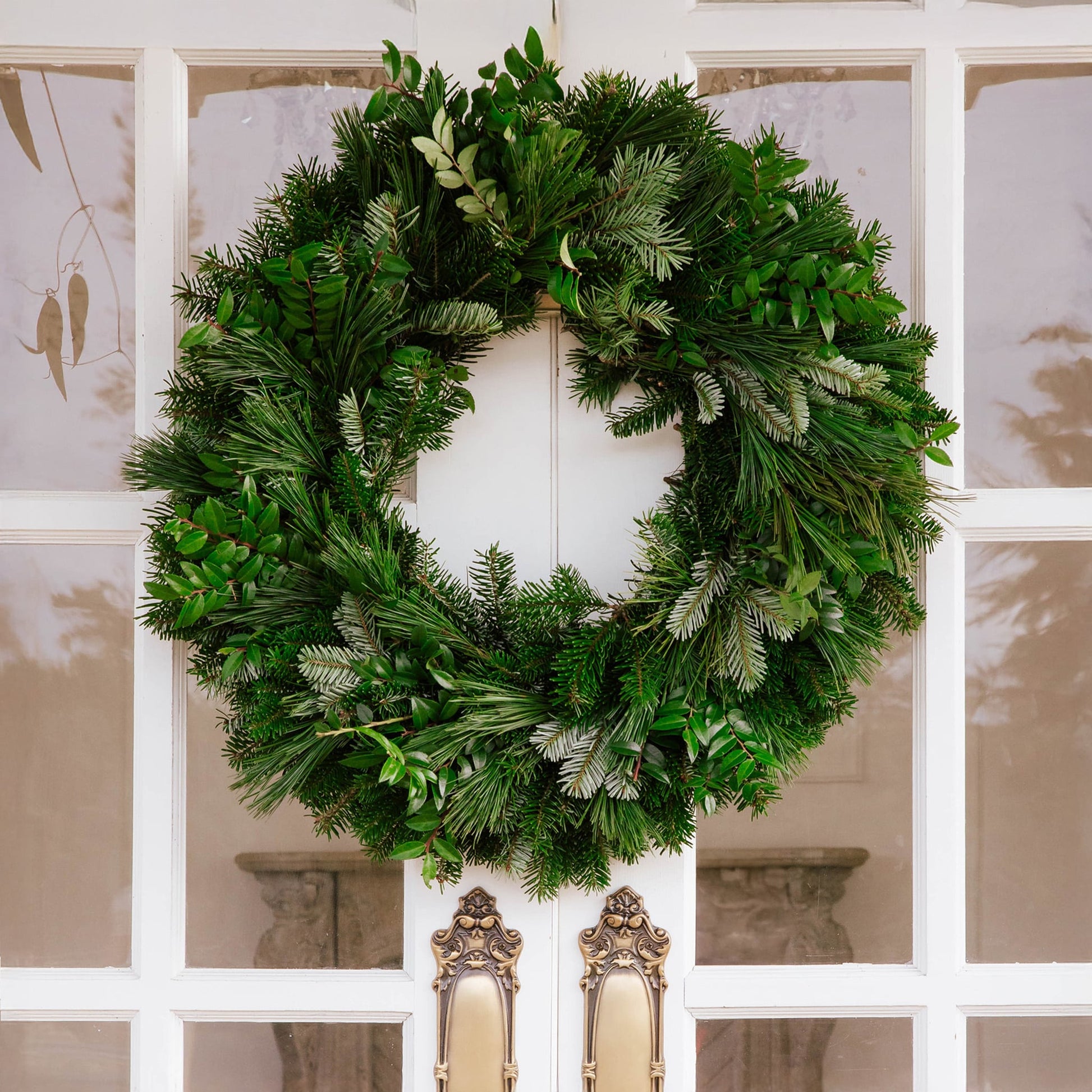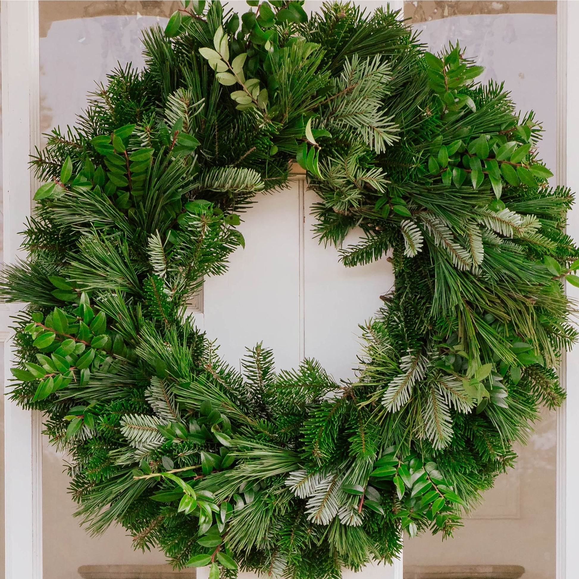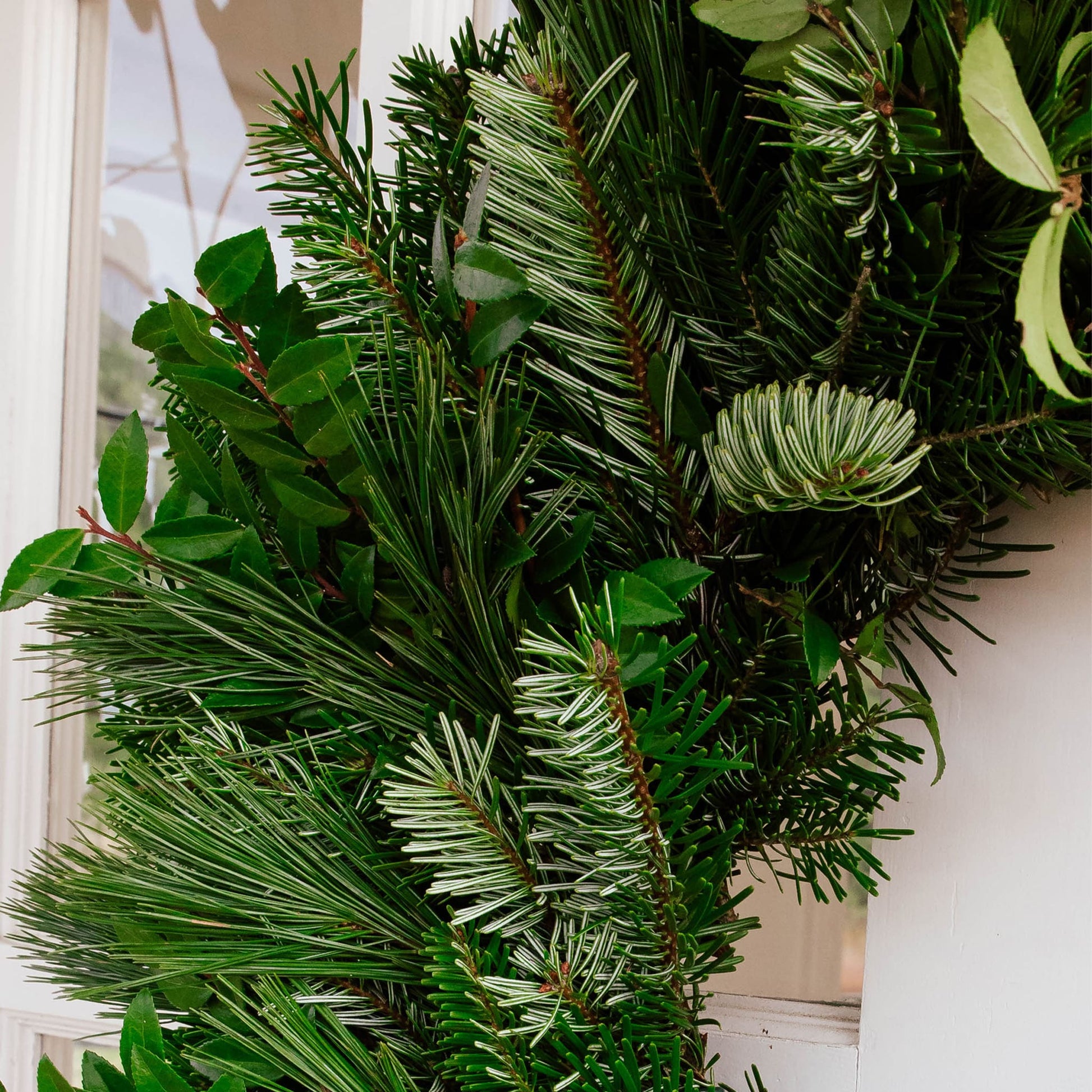 This wreath boasts the treasure of the deep forest. Made from a combination of Nordmann Fir with striking silver tips and princess pine with green huckleberry accents. The silver tips and green forest hues make this a holiday favorite.