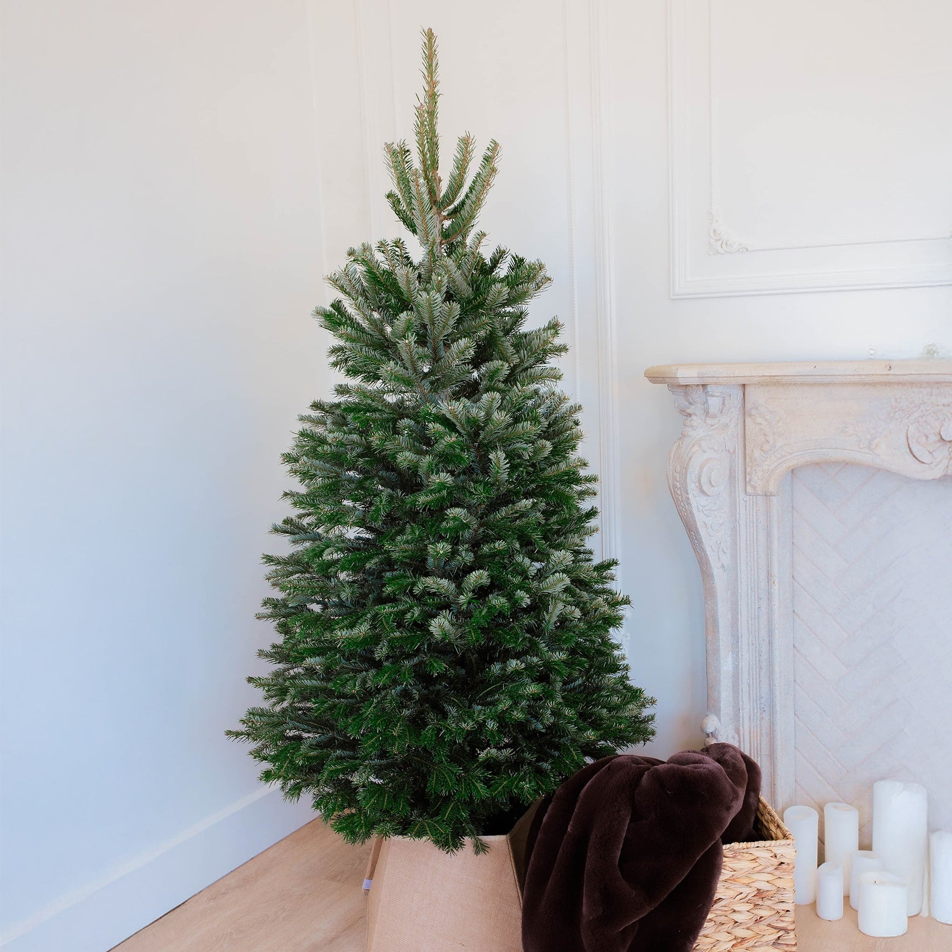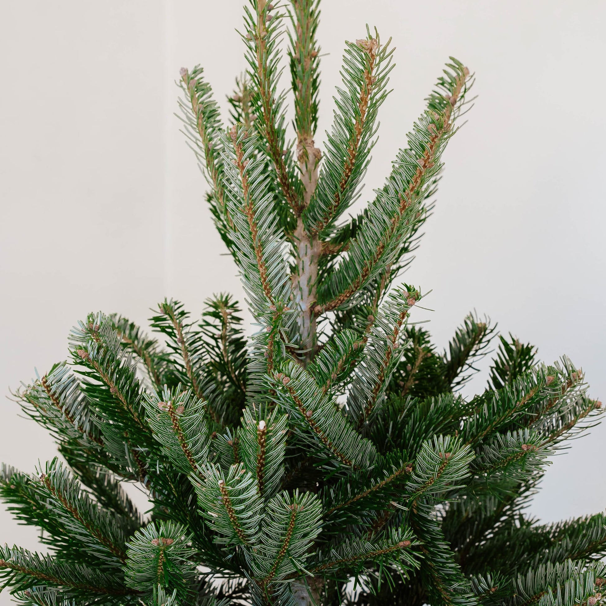 The Nordmann Fir is an outstanding choice. It combines the symmetry of the noble fir with unique silver tips to present an inviting canvas for the most ambitious tree decorator.