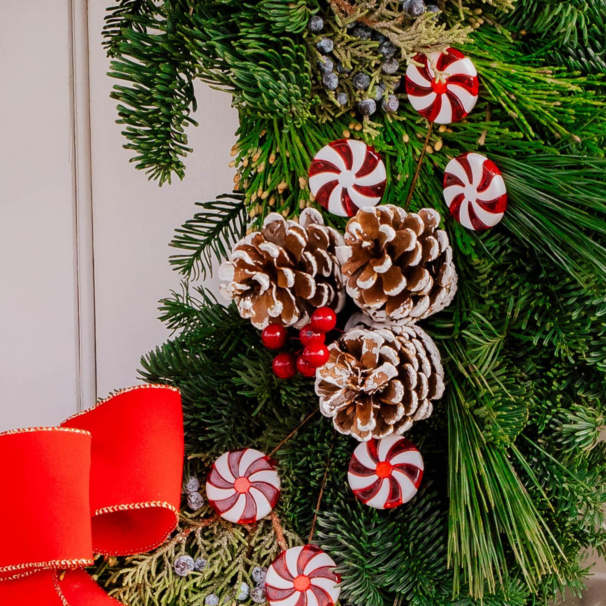Material: Noble Fir, Princess pine, Berried juniper, incense cedar, 3 white Australian pinecone clusters, peppermint candies and a red bow with gold trim.