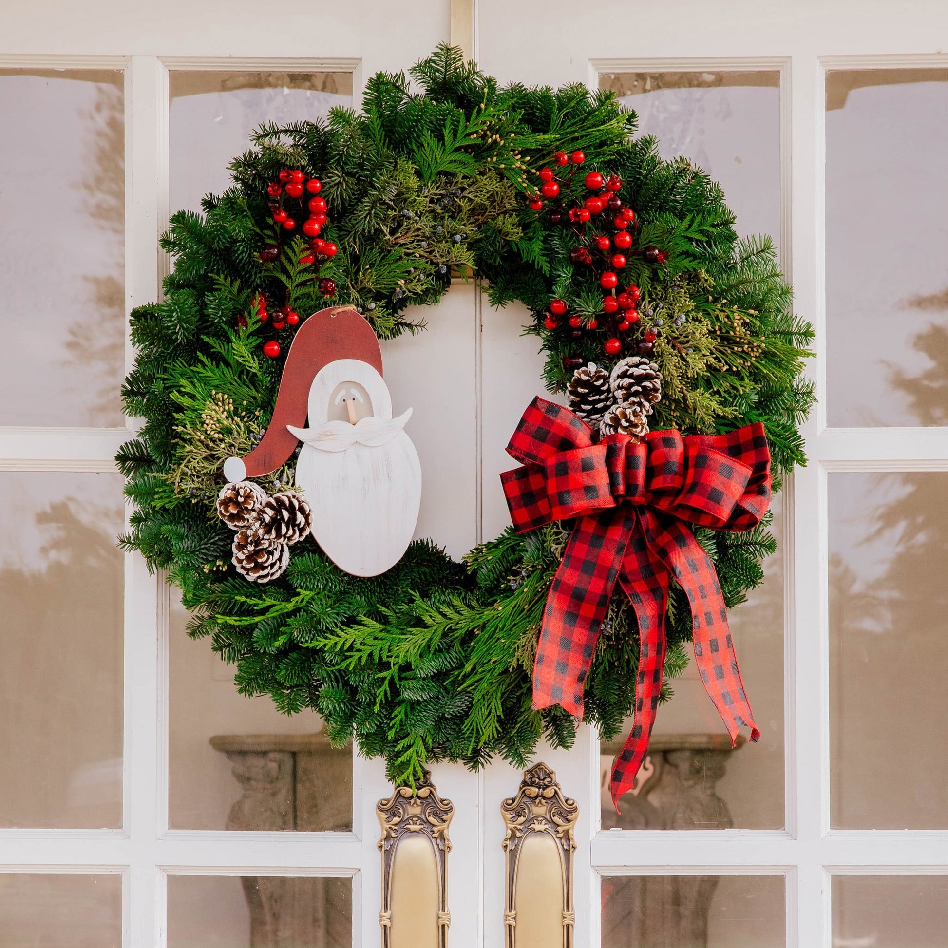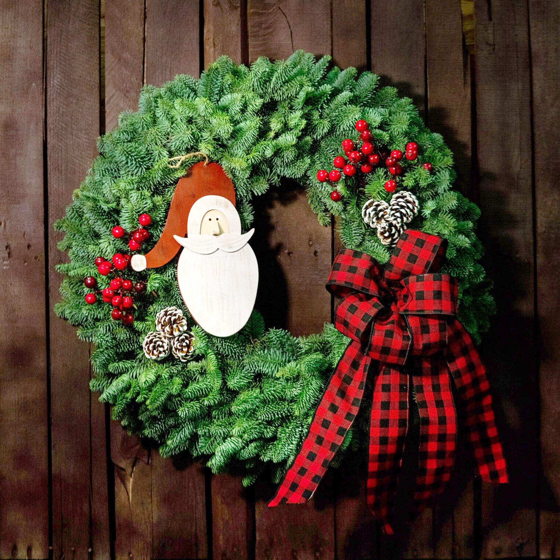 Material: Noble fir, Western Red Cedar, Berried juniper, Incense cedar, decorated with six white Australian cones, two red crab apple branches, a Santa head, and a checkered red and black bow.