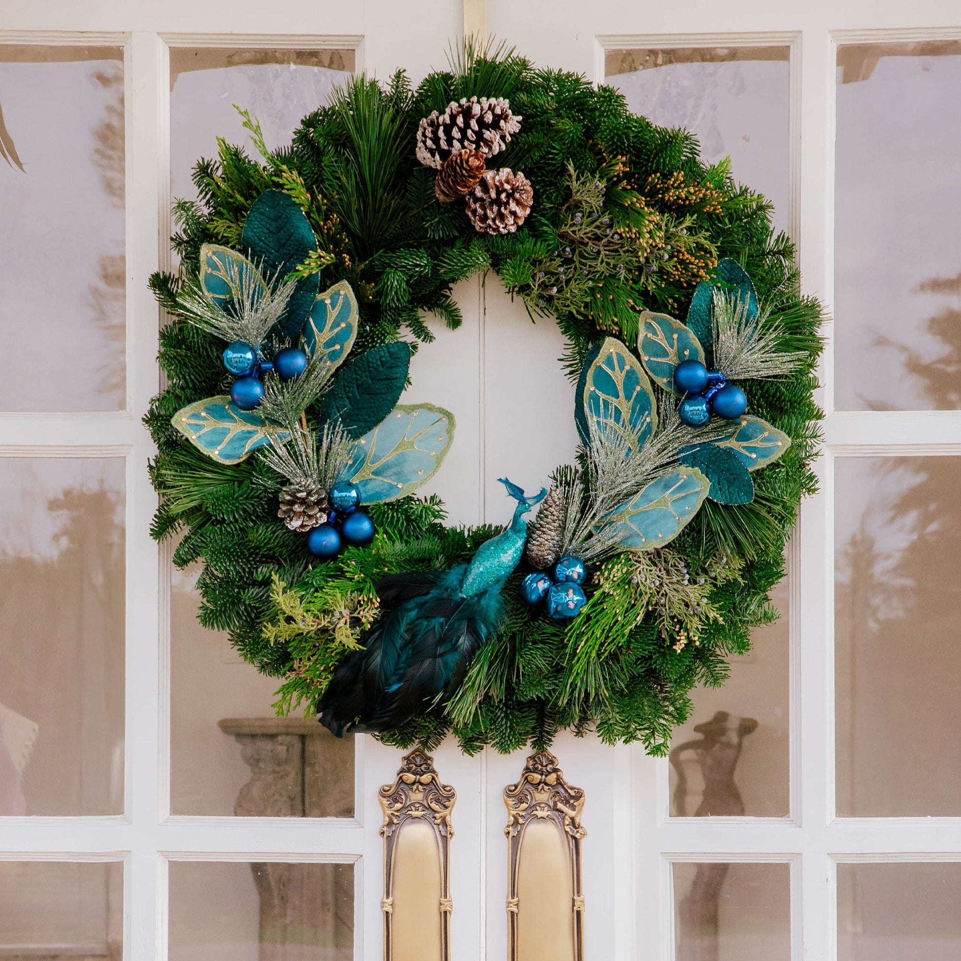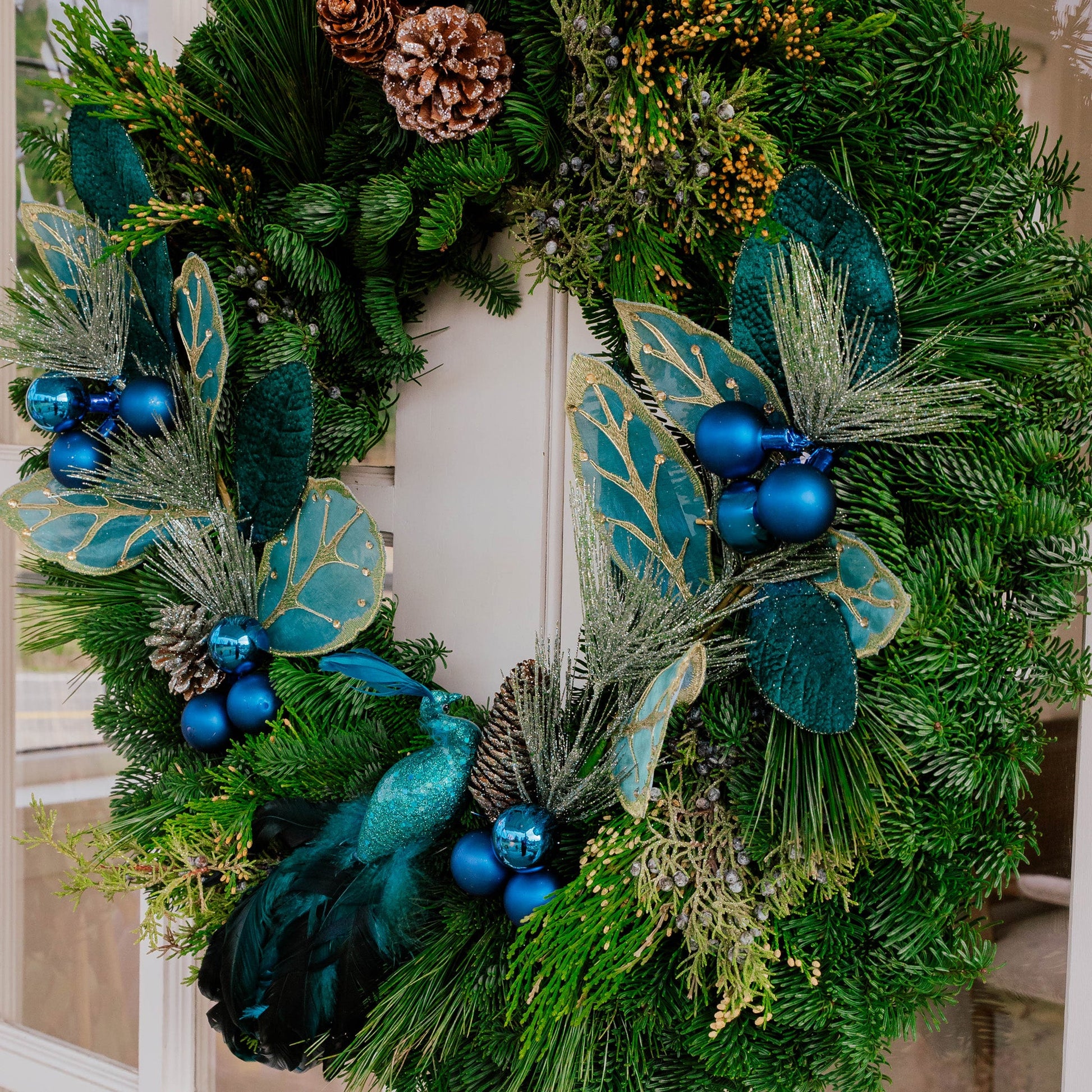 The peacock has been regarded in many cultures as a symbol of natures purest beauty. Our Peacock wreath continues the amazing natural colors of this royal bird. It is a combination of Noble fir, berried juniper, incense cedar and glitter pine cones, accented with imperial blue leaves with a stunning miniature peacock ornament nesting in the branches.