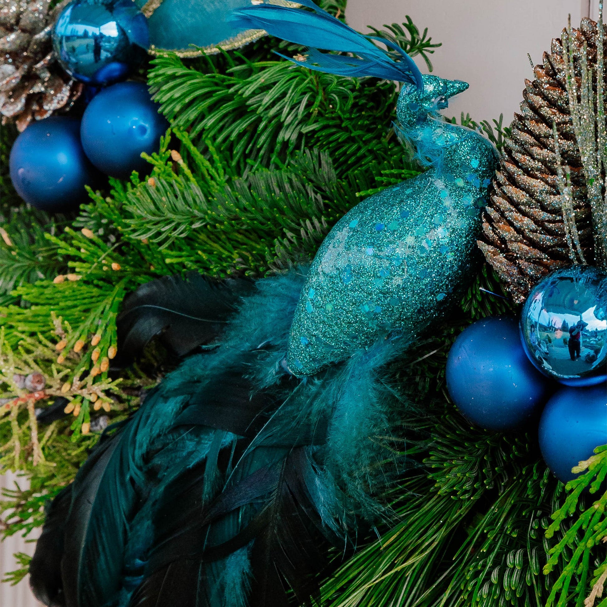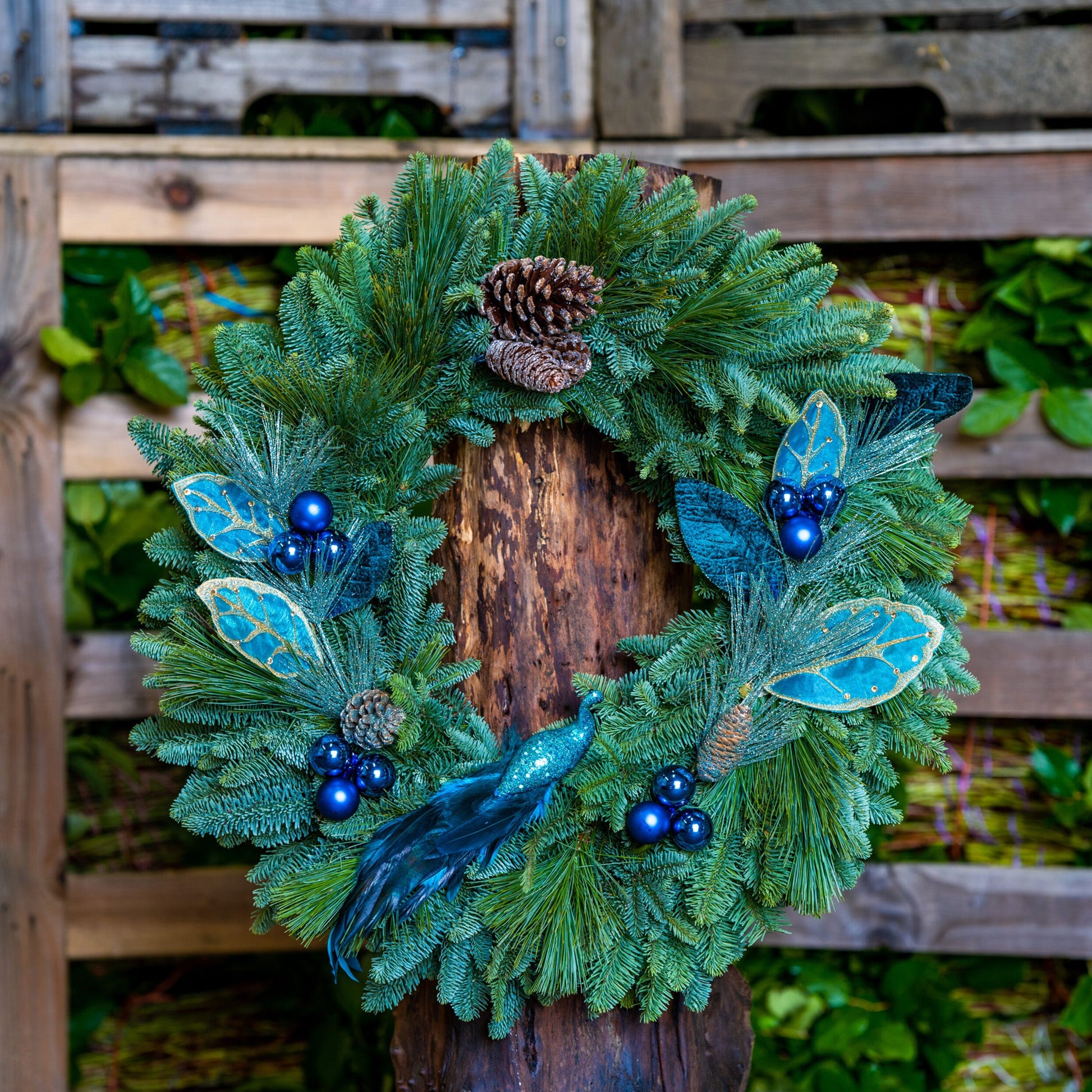 Material: Noble Fir, Incense Cedar, Juniper, princess Pine, blue leaves, 4 Blue ball clusters, Glitter pine, 2 Glitter pinecones and a Peacock ornament.