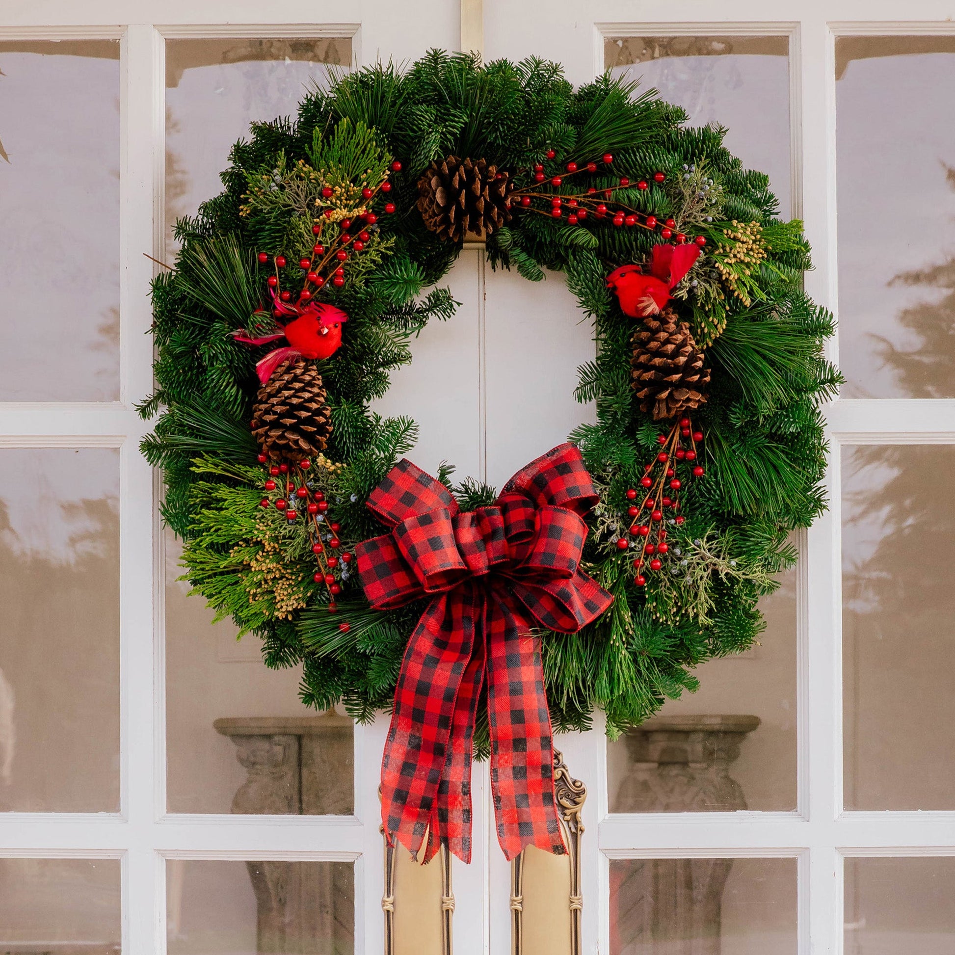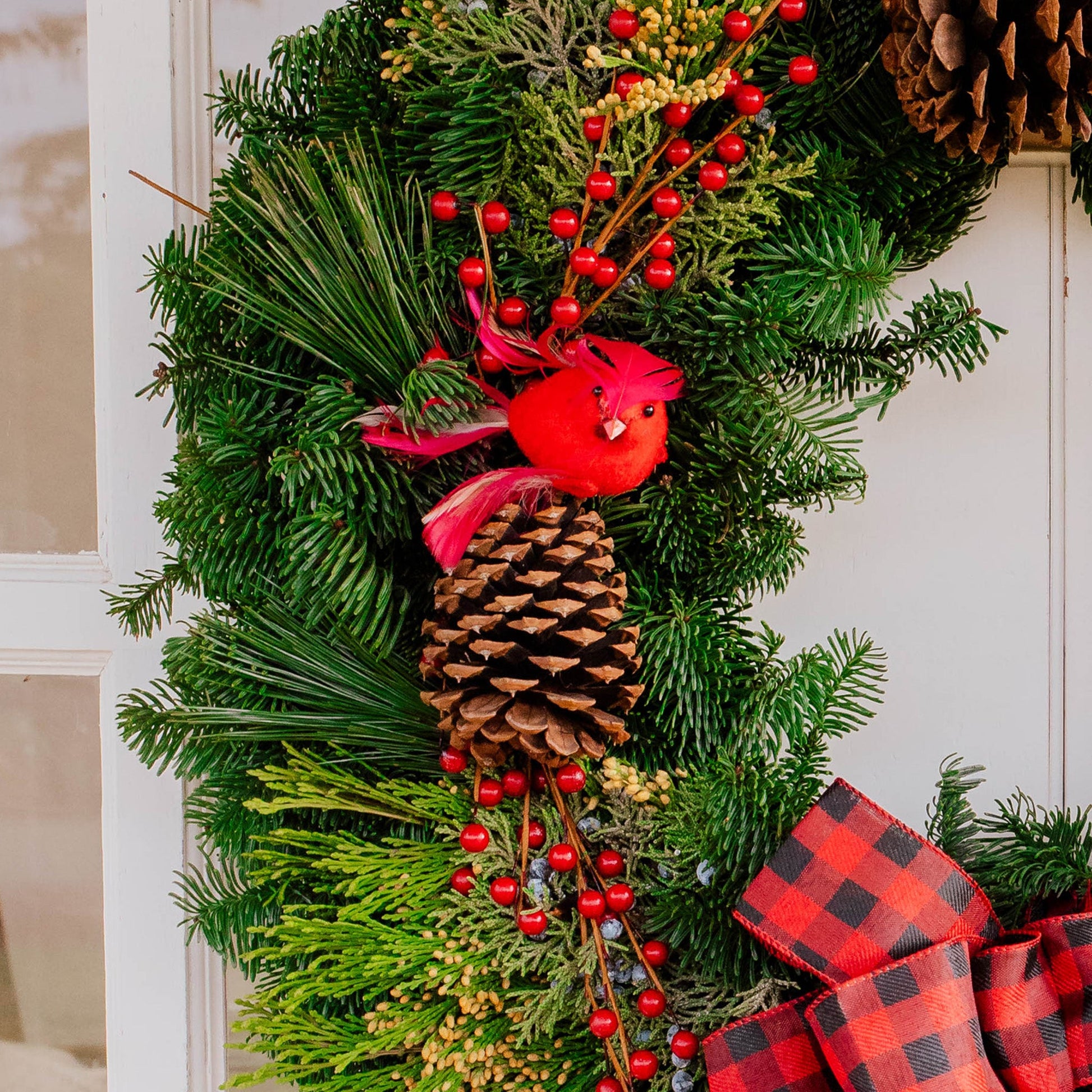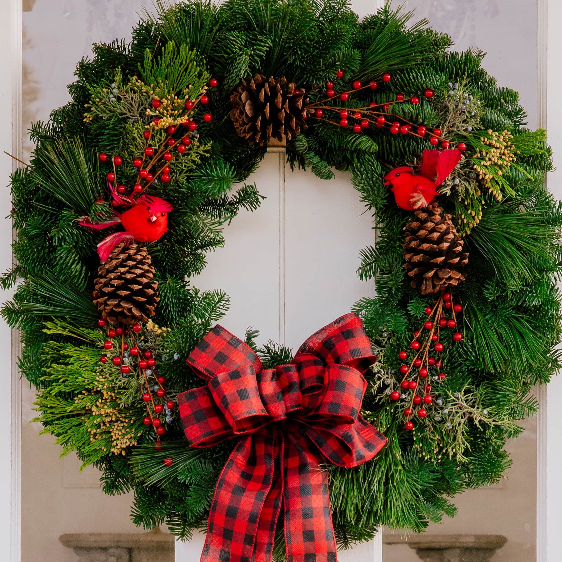 This combination of noble fir, Incense Cedar, berried Juniper and princess pine is distinguished by the appearance of two cardinals on either side of the wreath. The sight of a cardinal in winter is sure to brighten the day of anyone who sees it.