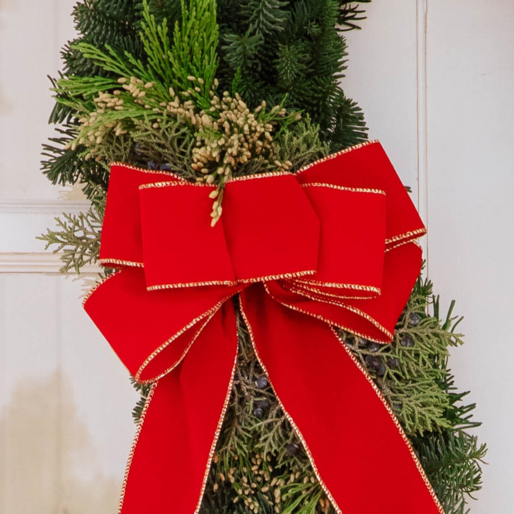 Material: Noble fir, Berried Juniper and Incense cedar and a Large Red Bow with Gold Trim.