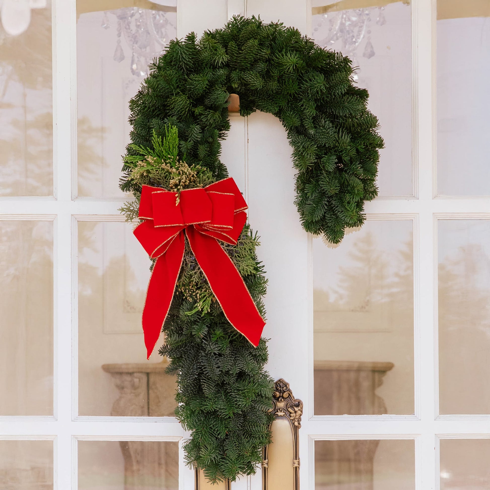 This whimsical shape will appeal to the child in all of us. The candy cane is one of the most recongnizable forms associated with the holidays. It combines noble fir, berry juniper and incense cedar with a bright red bow trimmed in gold. The Child's Delight is sure to bring a smile to everyone's face.