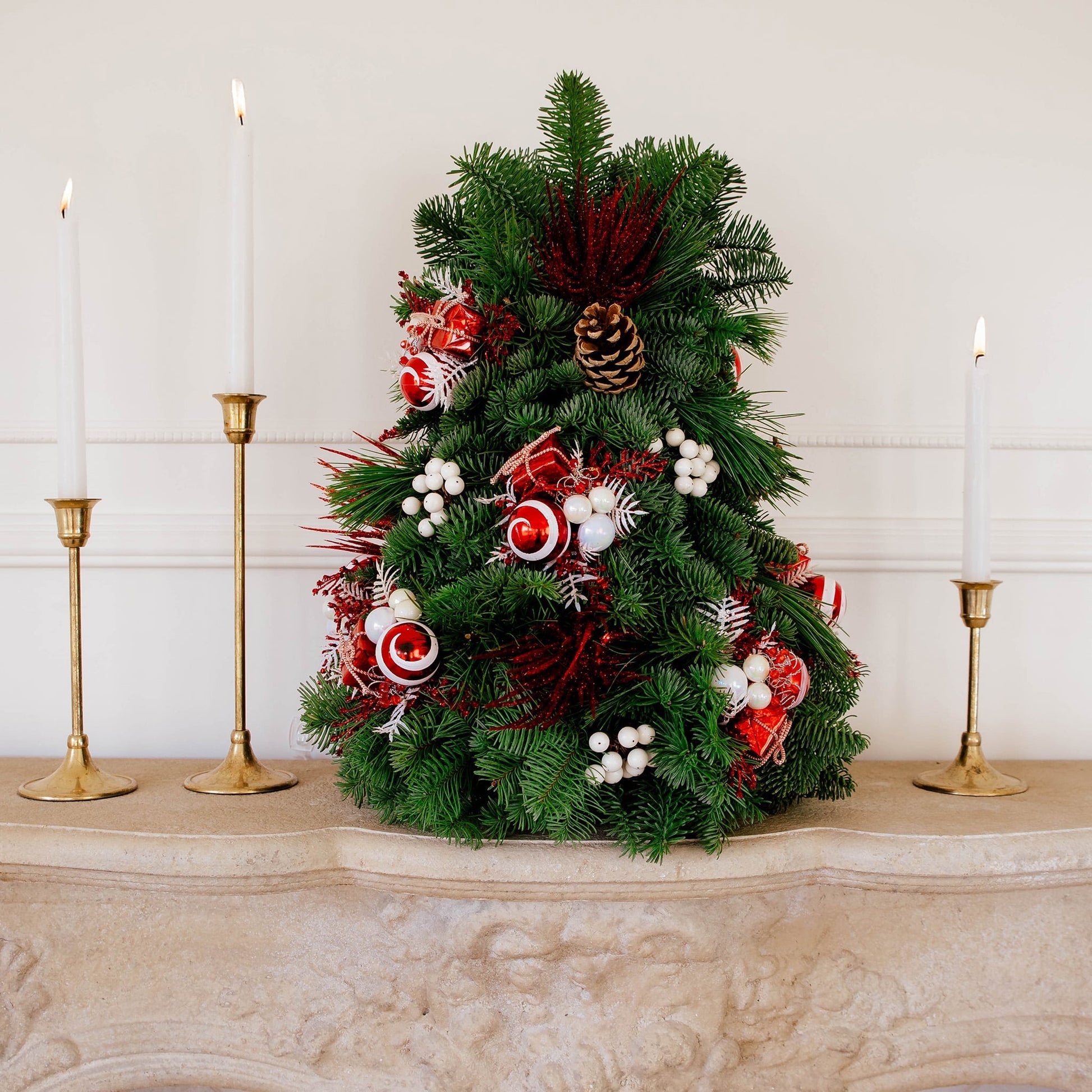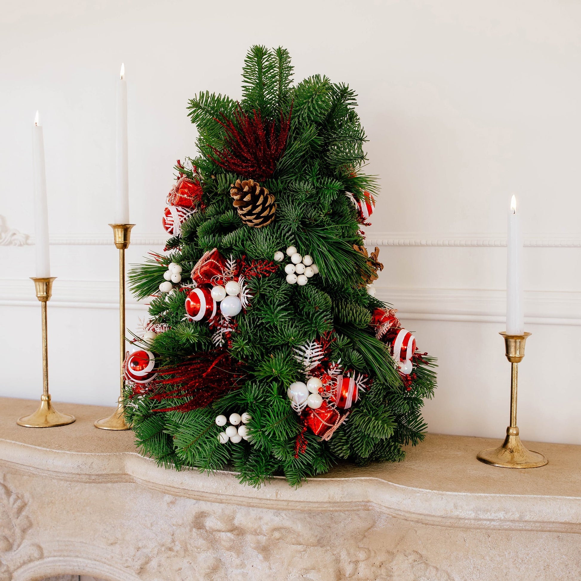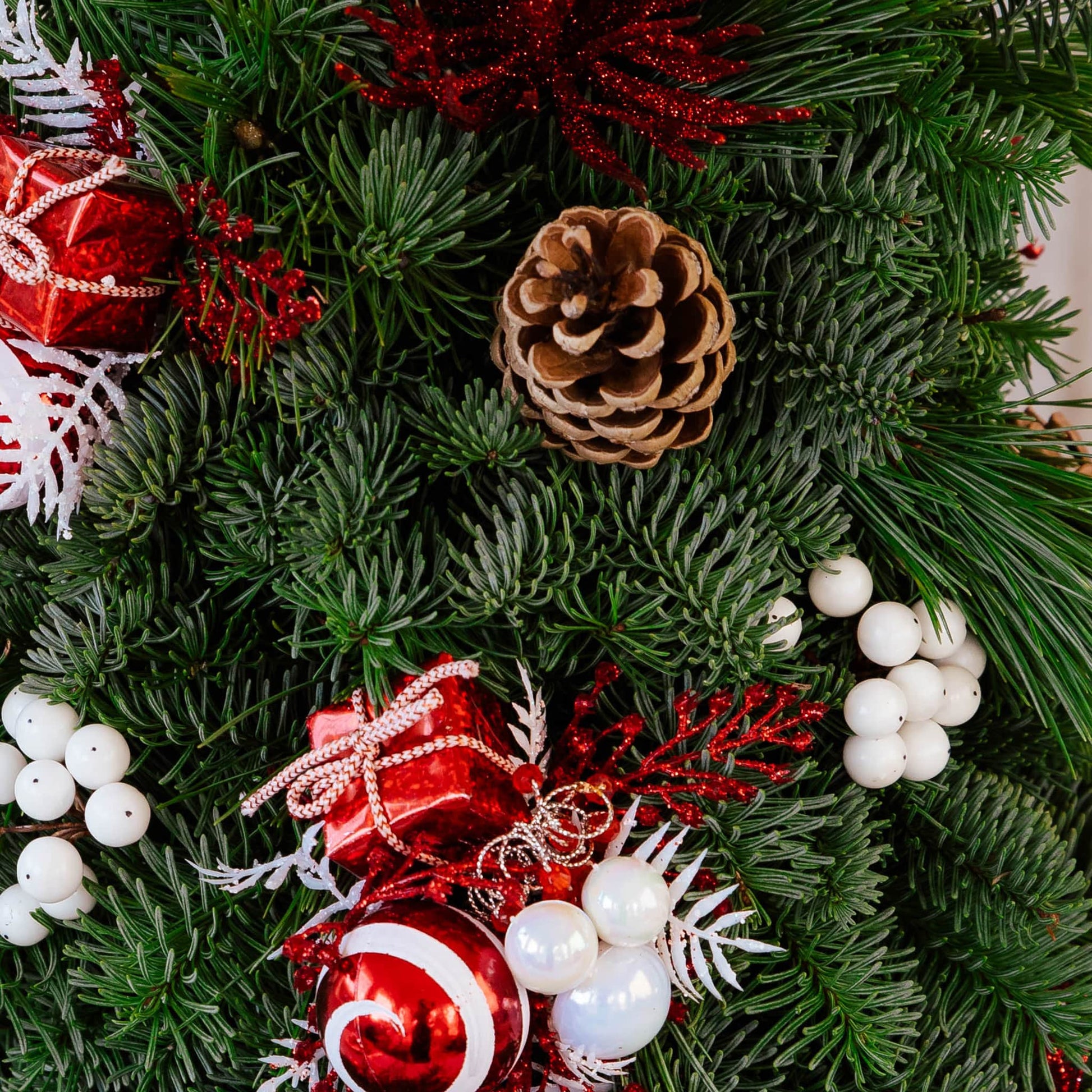 Material: Noble Fir, Princess pine, Pinecones, Peppermint, A Mini gift box, White cherry clusters, and Red Spray.