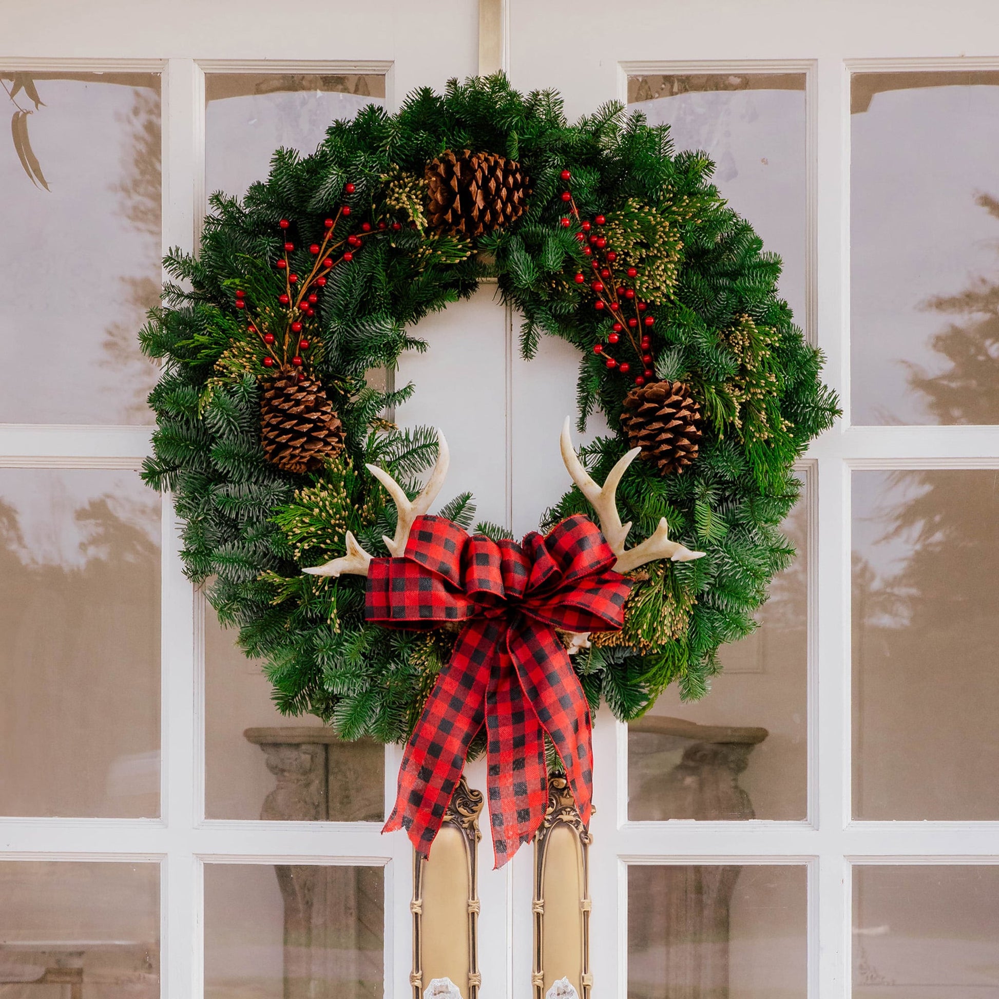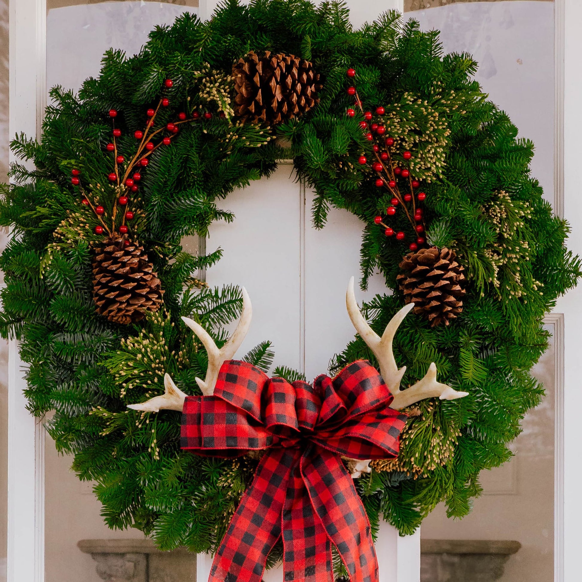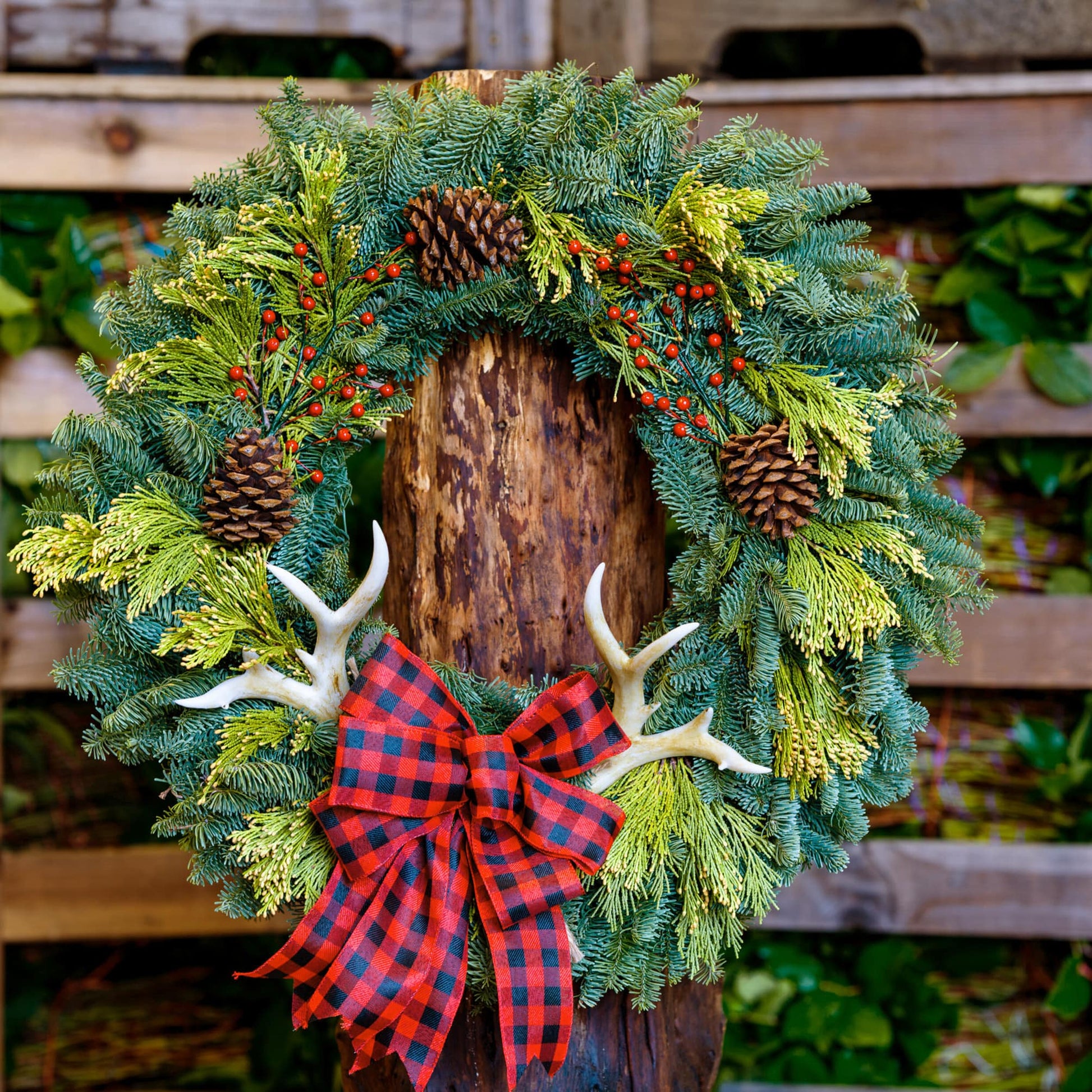 The Deer Hunter wreath is sure to be a hit with the sportsman and outdoor enthusiast in every home. It is a winning combination of Noble fir, Incense Cedar and accented with bright red berries, cones and faux antlers. The Hunter Plaid bow is the perfect addition that ties the festive outdoor Christmas theme together!.