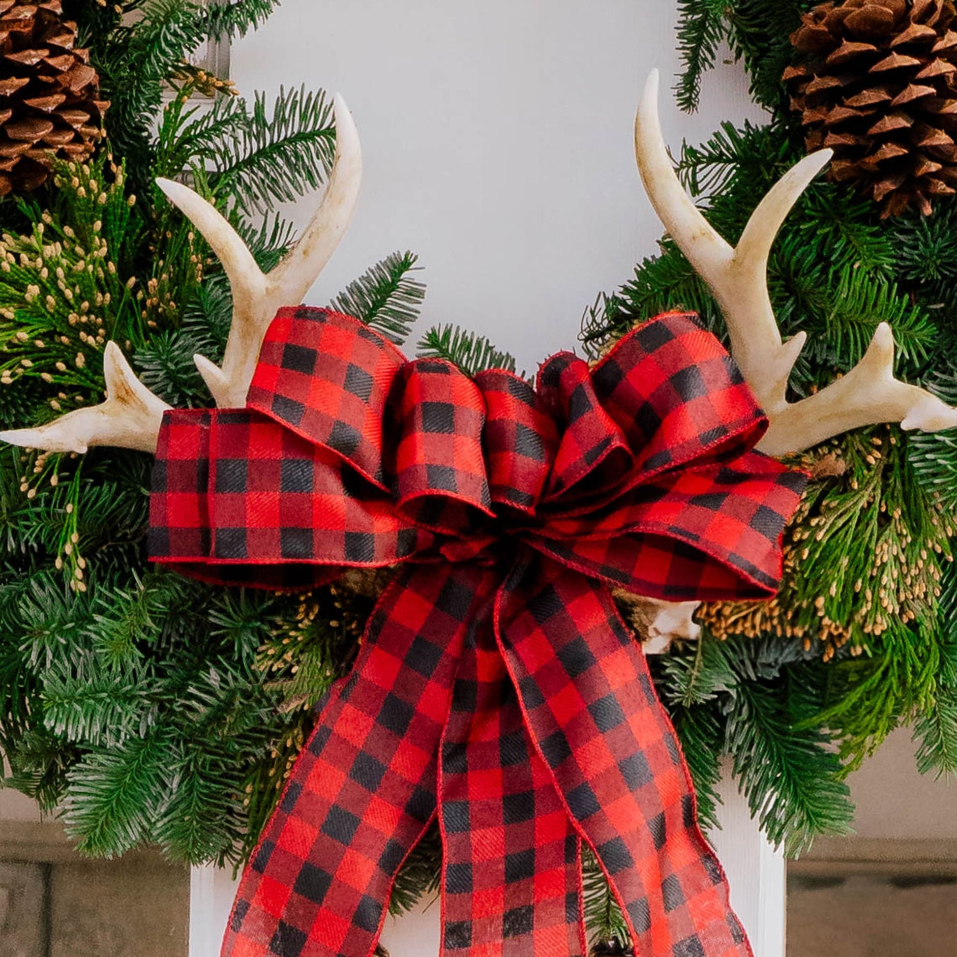 Material: Noble fir, Incense Cedar & Decorated with Red berries, Faux Antlers, 3 Ponderosa Pinecones and a Red & Black Bow.