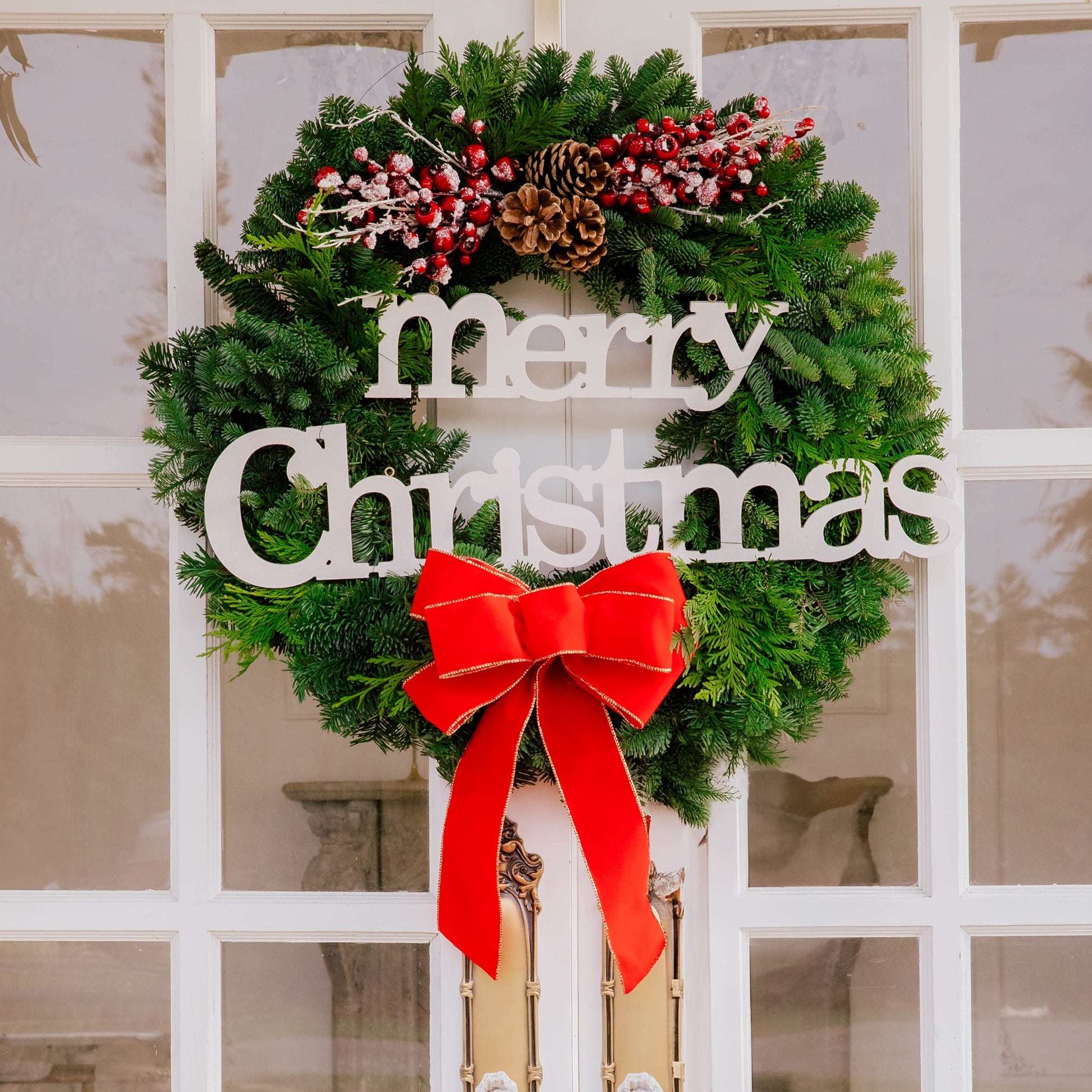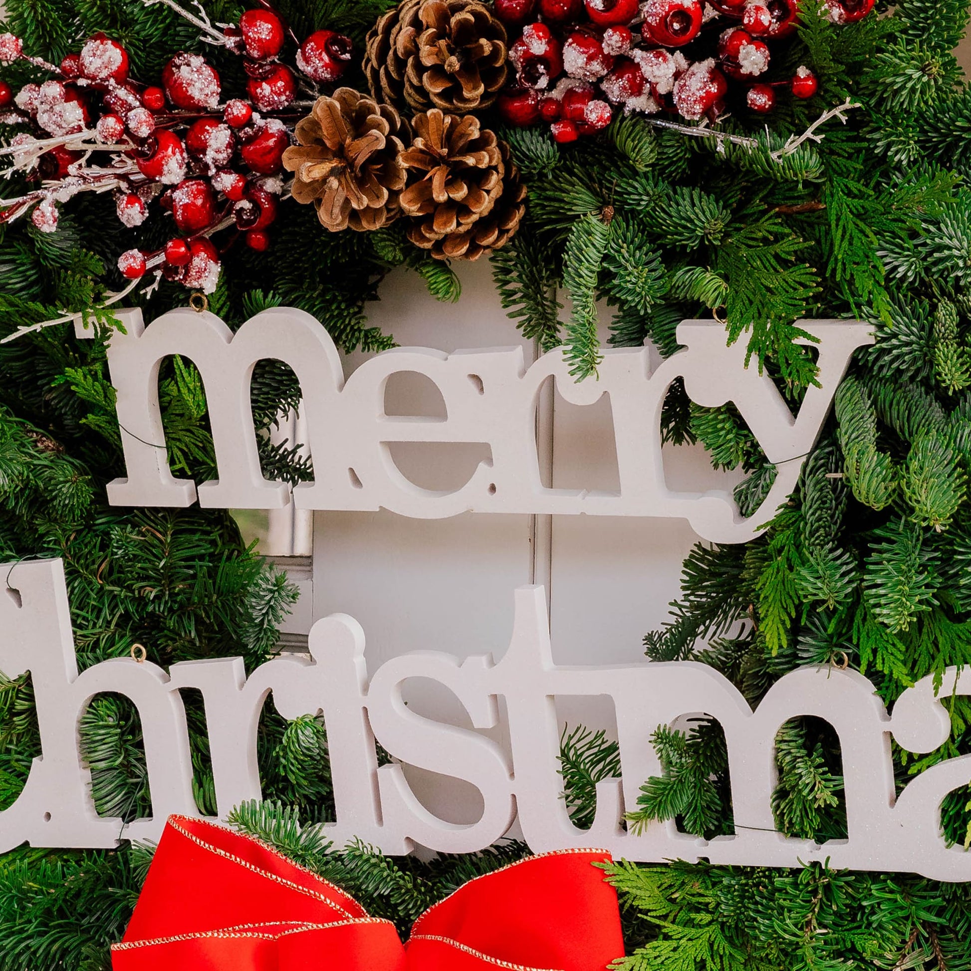 Material: Noble Fir, Western Red Cedar, 2 ice berry branches, 3 Australian Pinecones, Merry Christmas cutout and a white bow with red snowflakes.