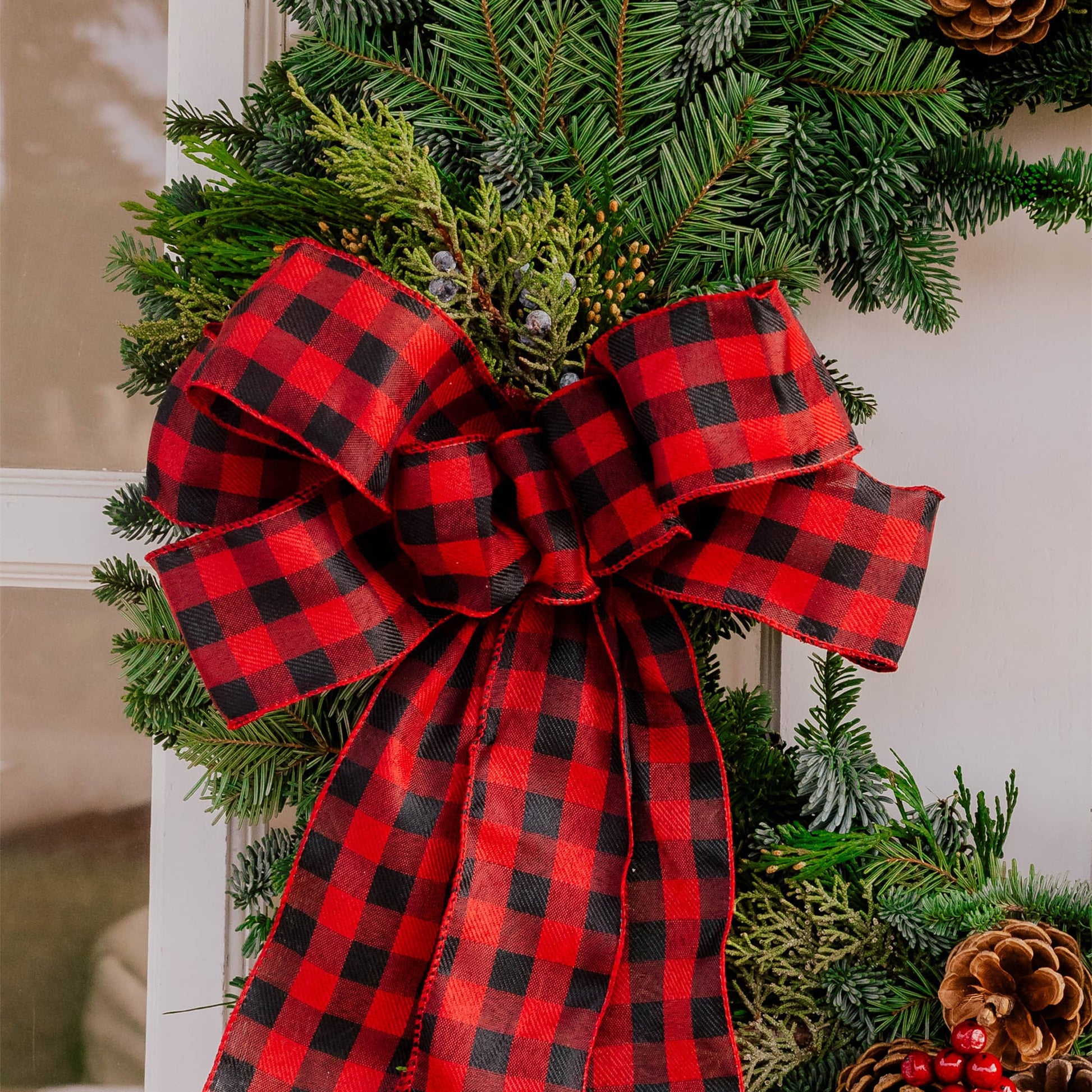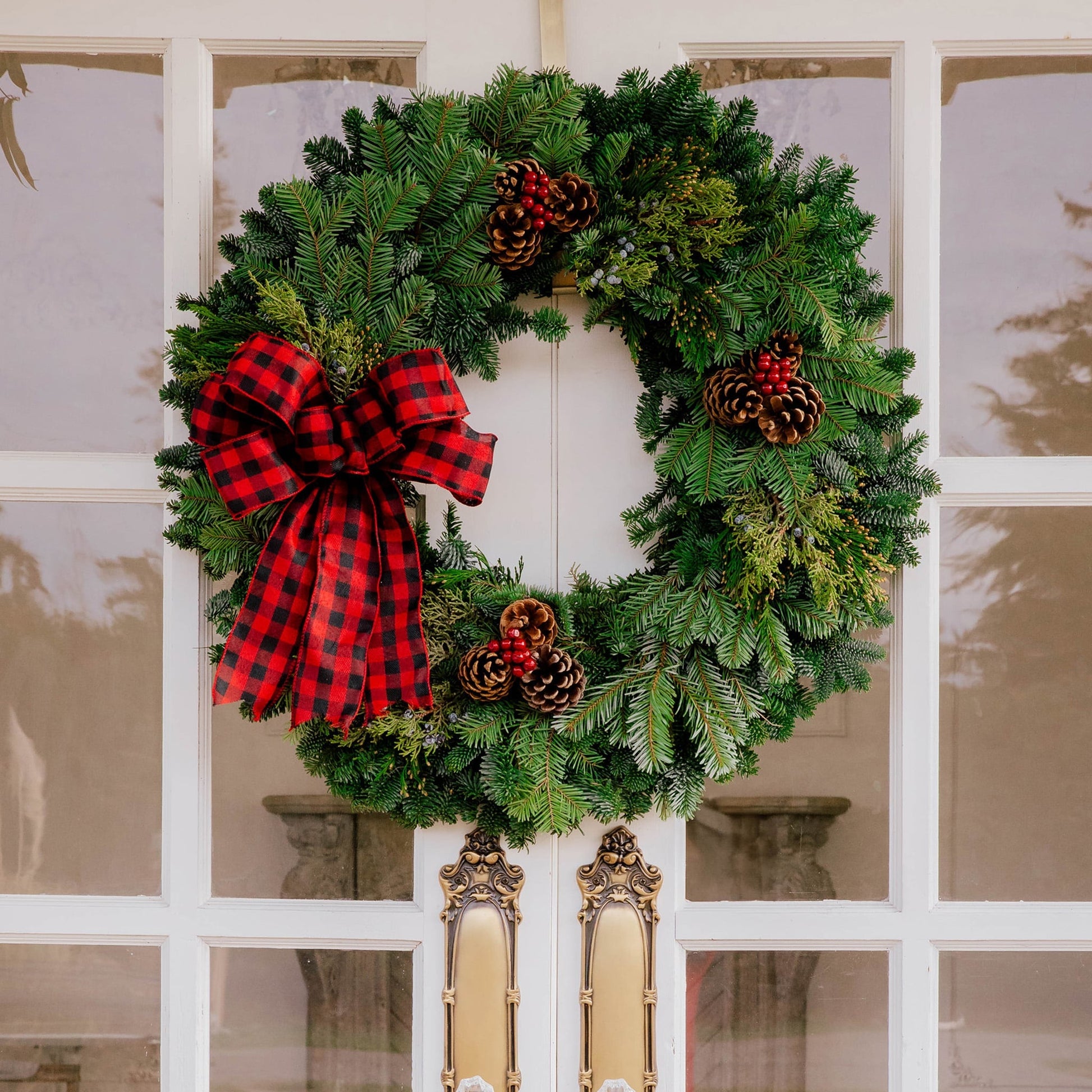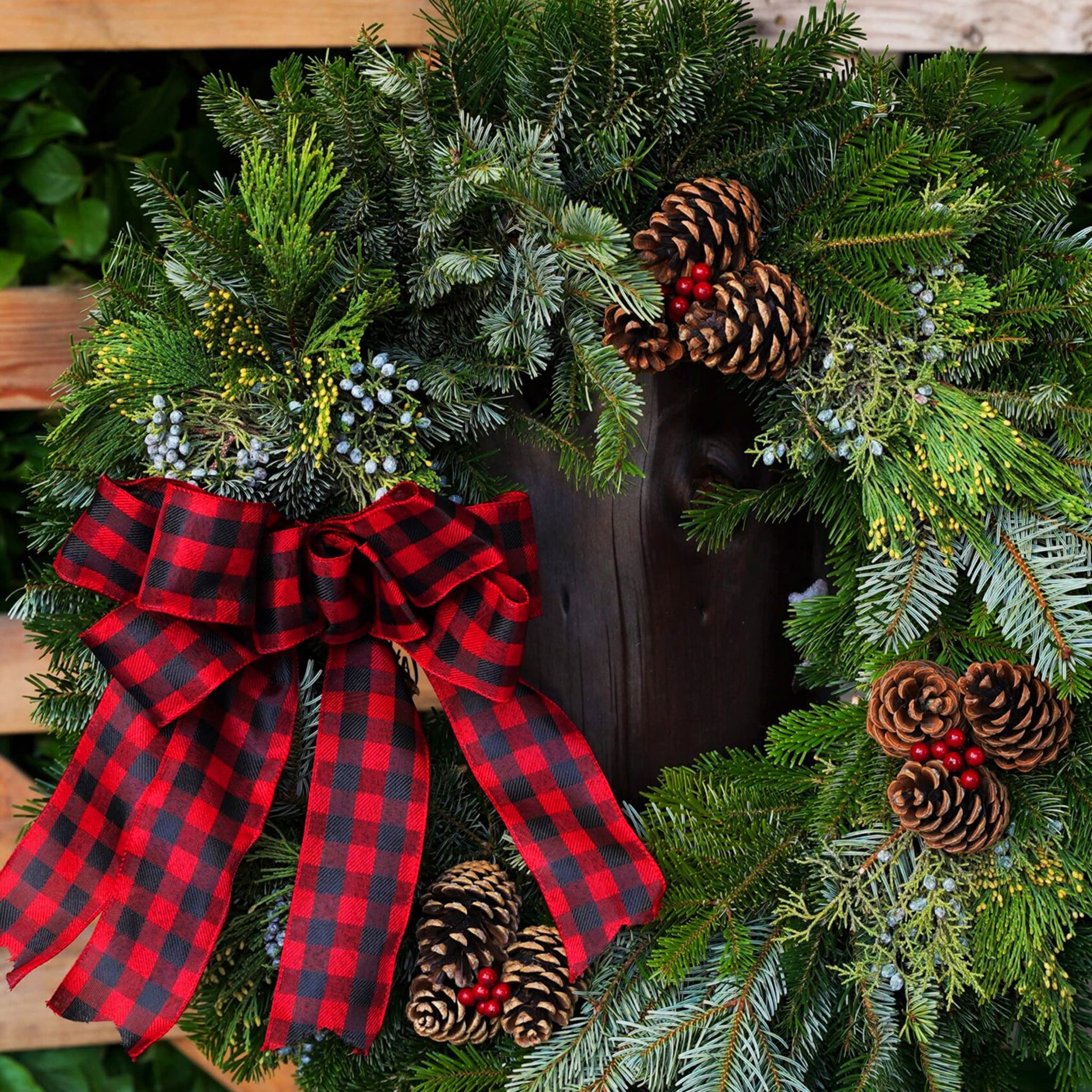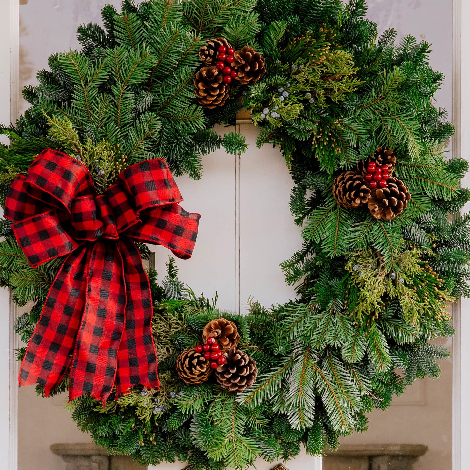 Material: Noble Fir, Silver Fir, Juniper, Incense Cedar, 3 Bunches of three Australian Pinecones, Three Cherries and a Red and Black plaid bow.