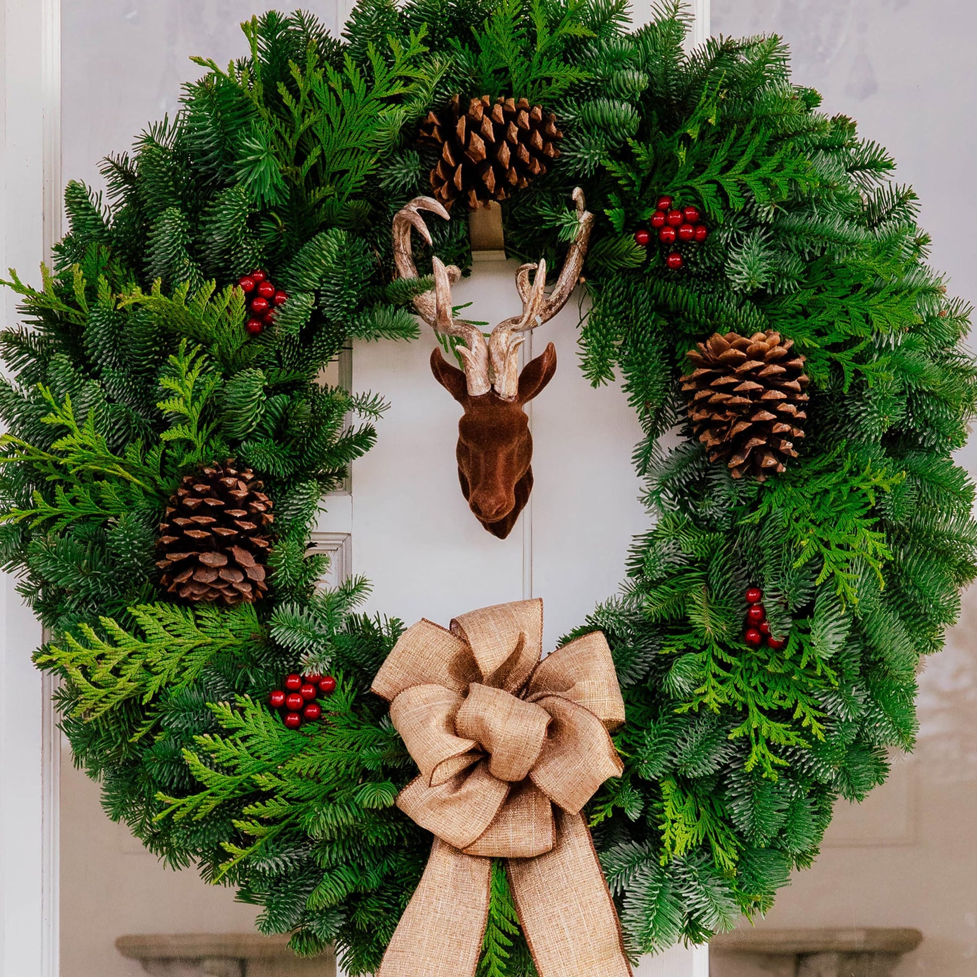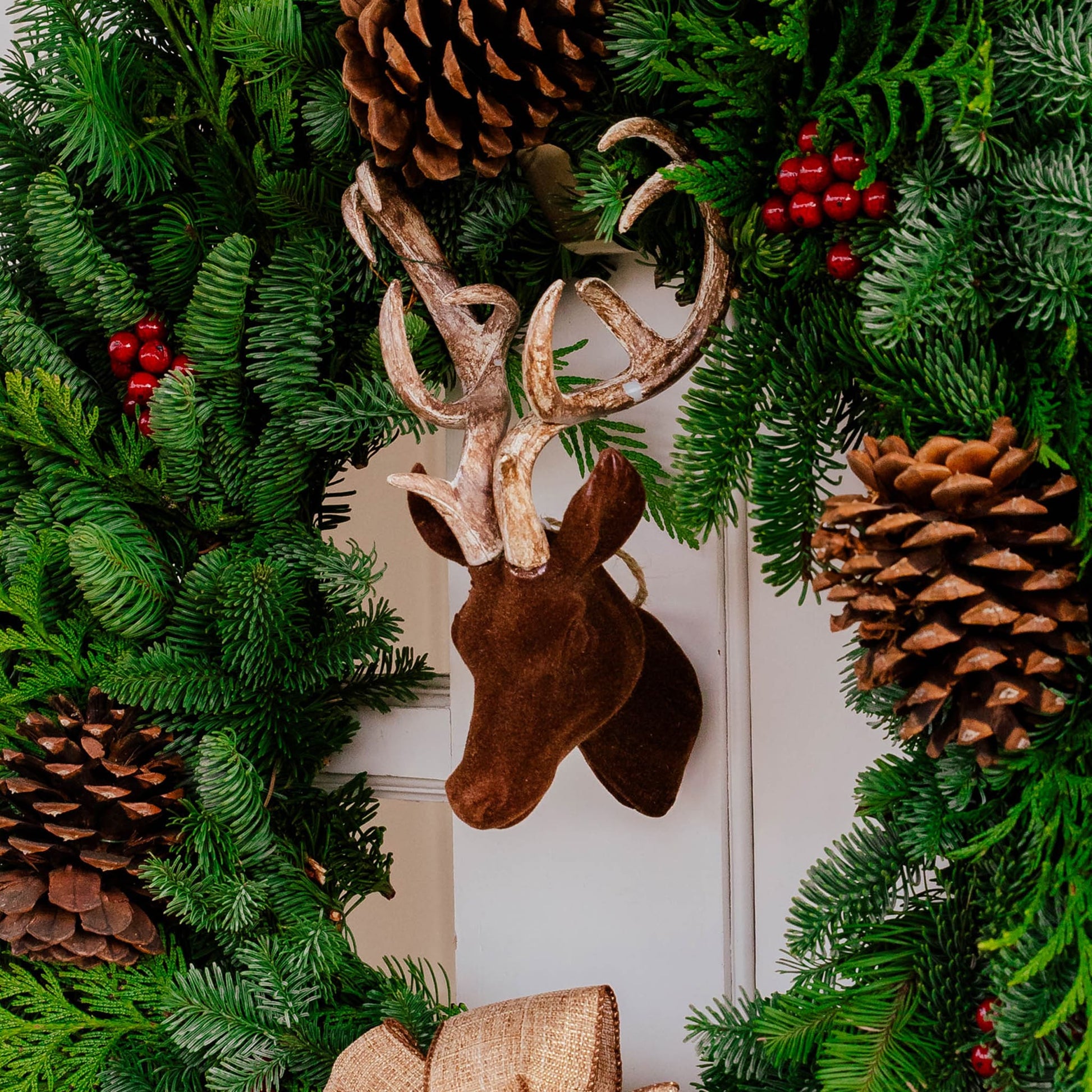 The Amber Stag is another of out wreath that have special appeal to outsdoorsmen. It combines noble fir, western red cedar with cones cherry clusters and a bow. In the center is a realistic stag's head covered in velvet with a full rack.