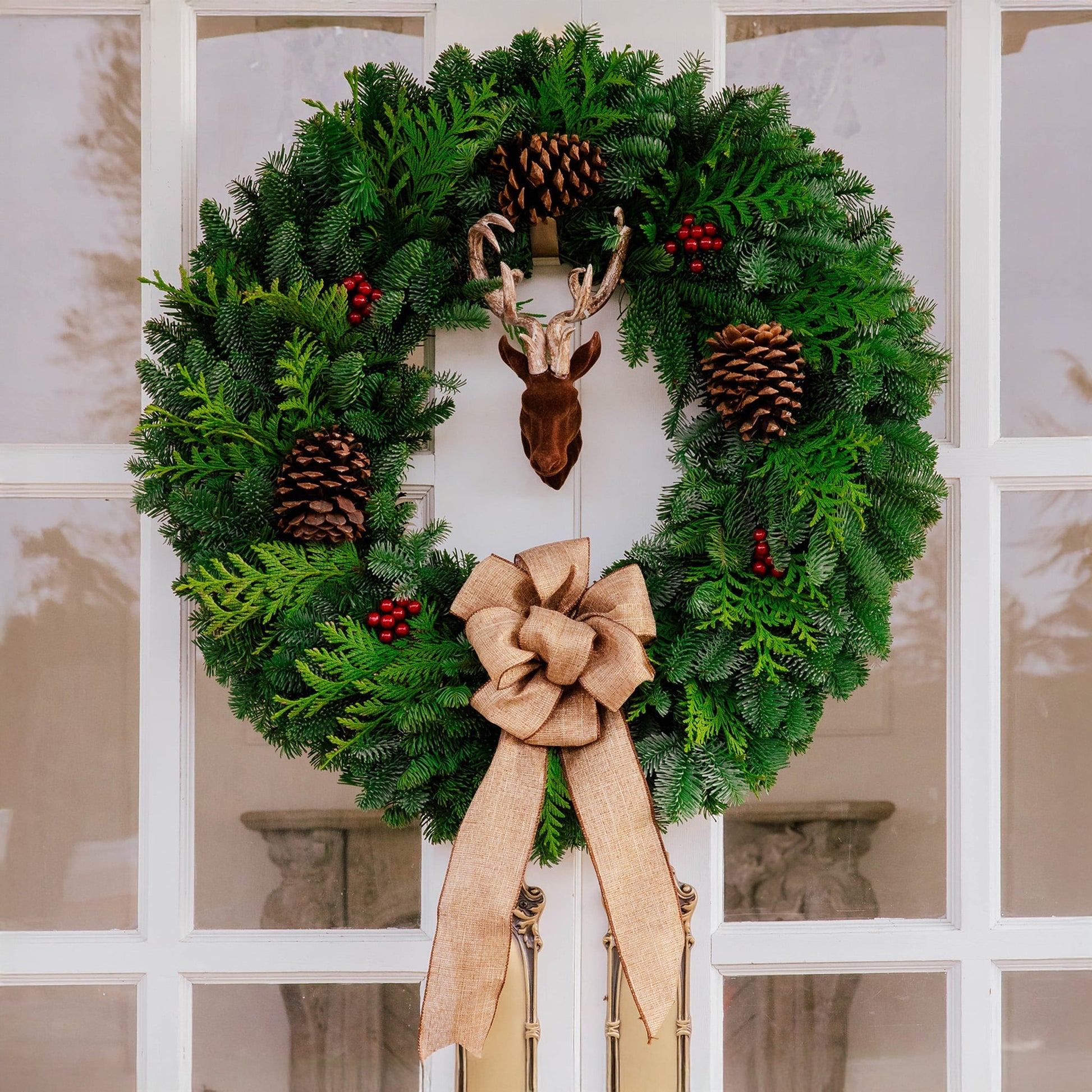 Material: Noble Fir, Western Red Cedar, 2 ponderosa pinecones, 4 Red Cherry Clusters, a brown stags head, and a gold bow with brown trim.