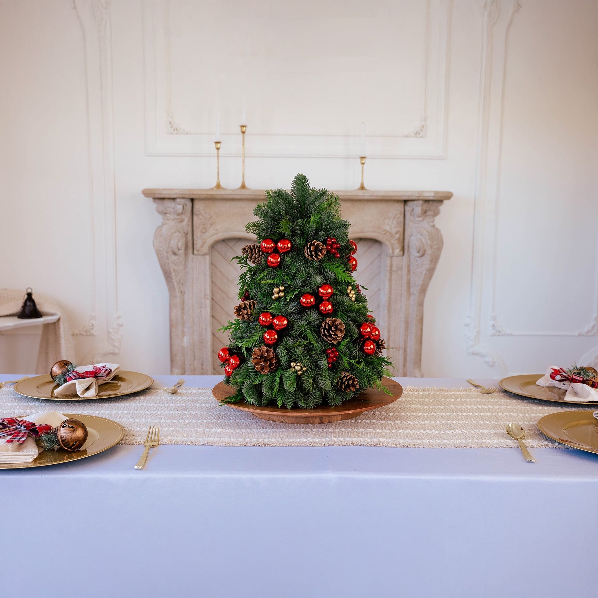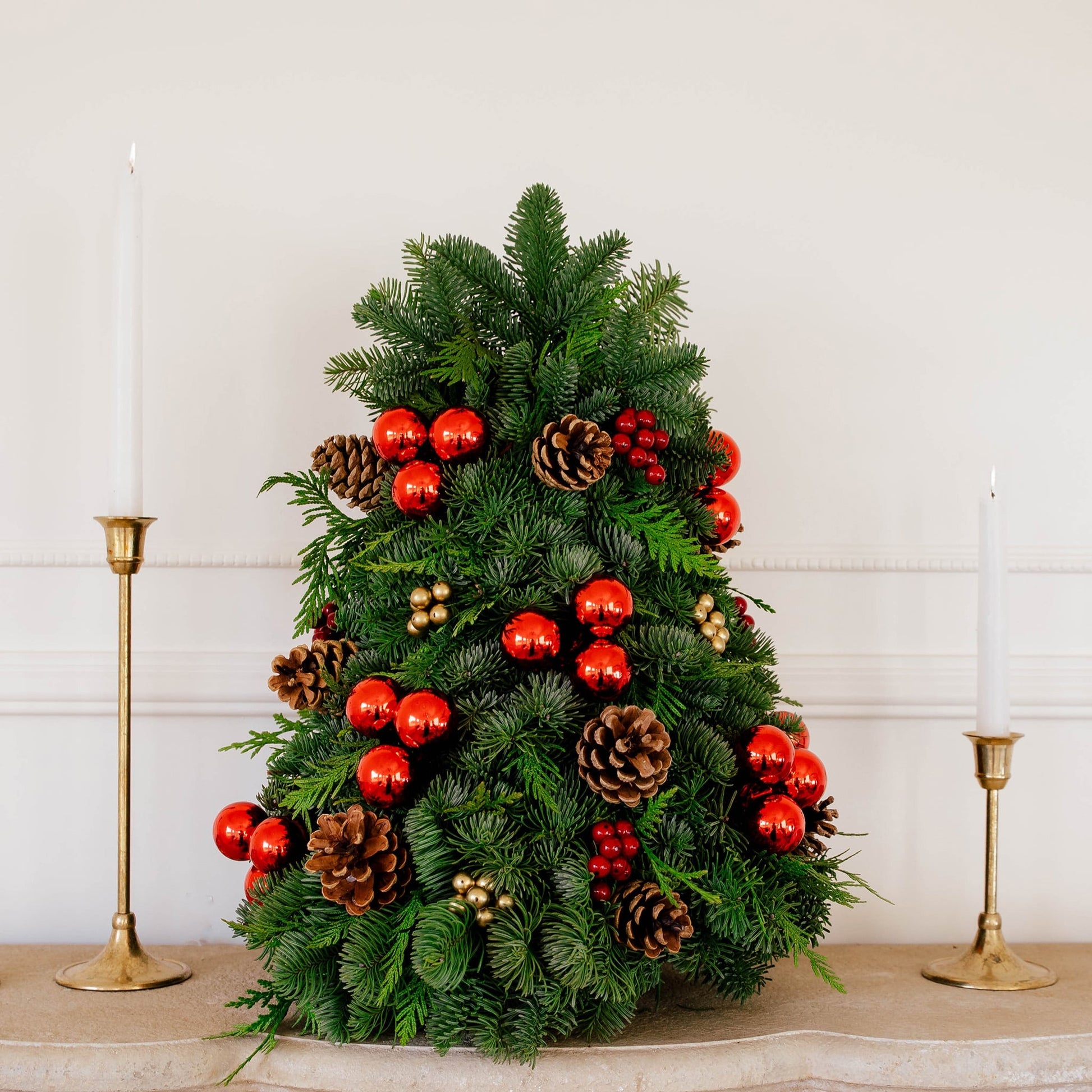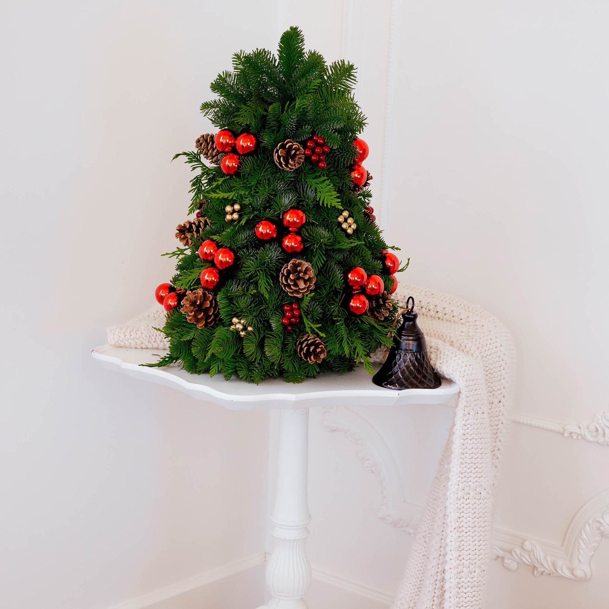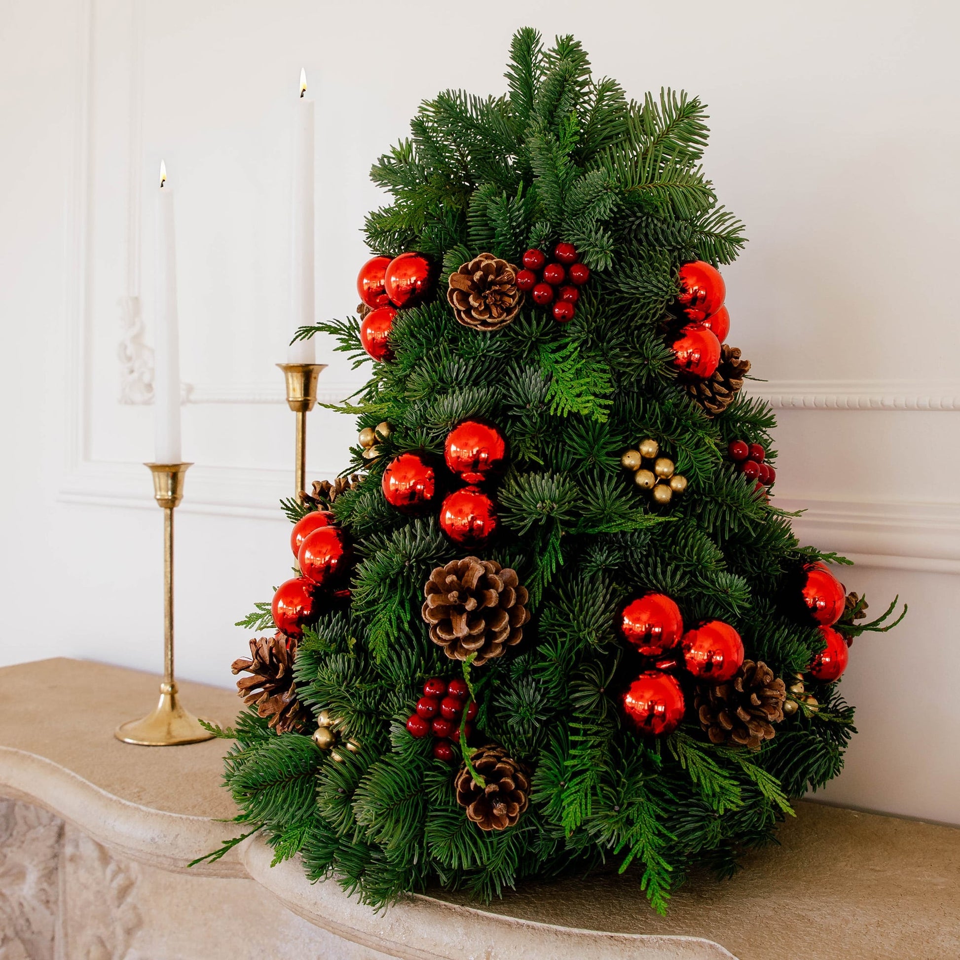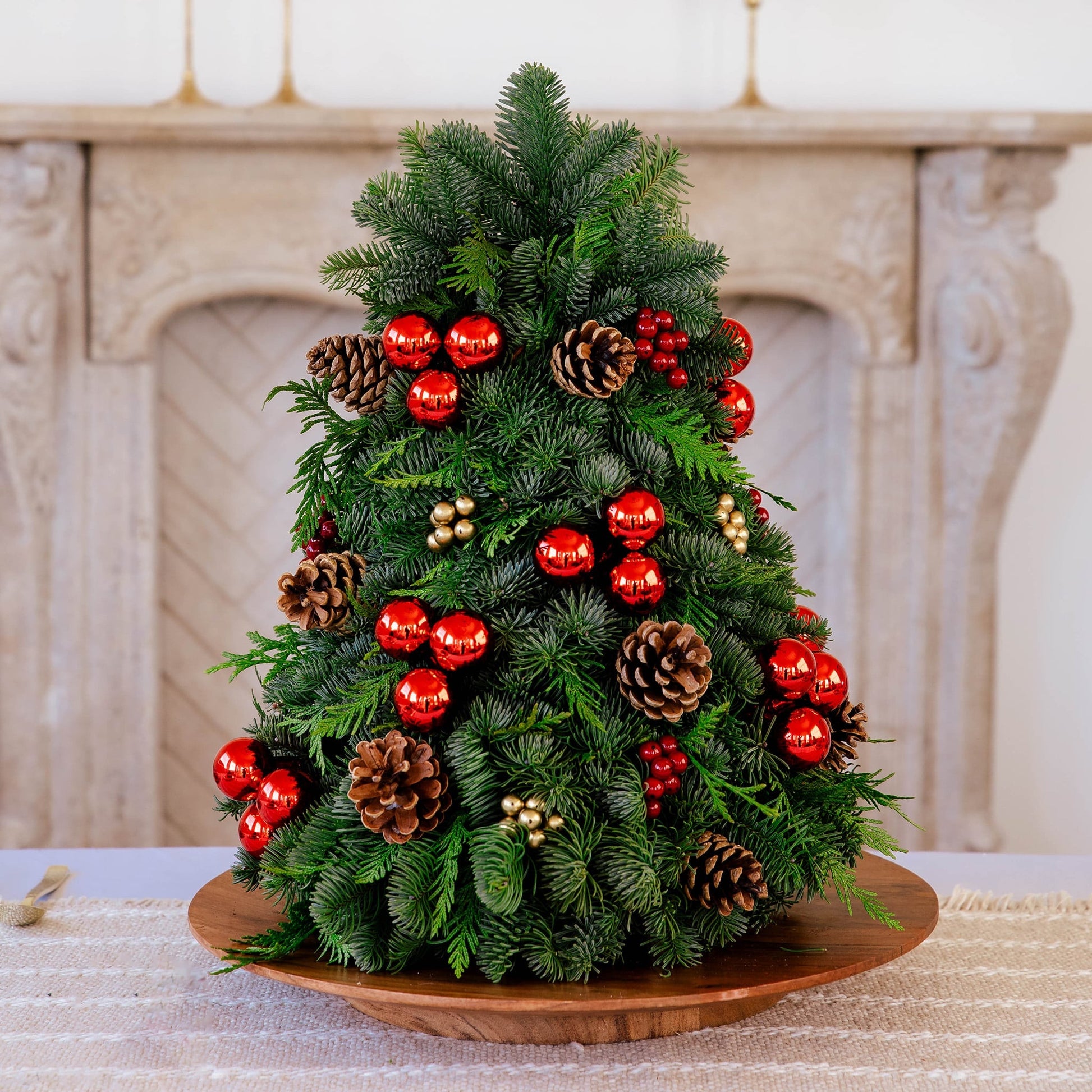 The Decorators Delight is the complete package. This tabel top tree shines bright even to the most demanding holiday decorator. Combining Noble Fir, Western red cedar, and pine cone with red and gold cherry clusters, it is finished with bright red christmas ornaments to capture the complete holiday look.